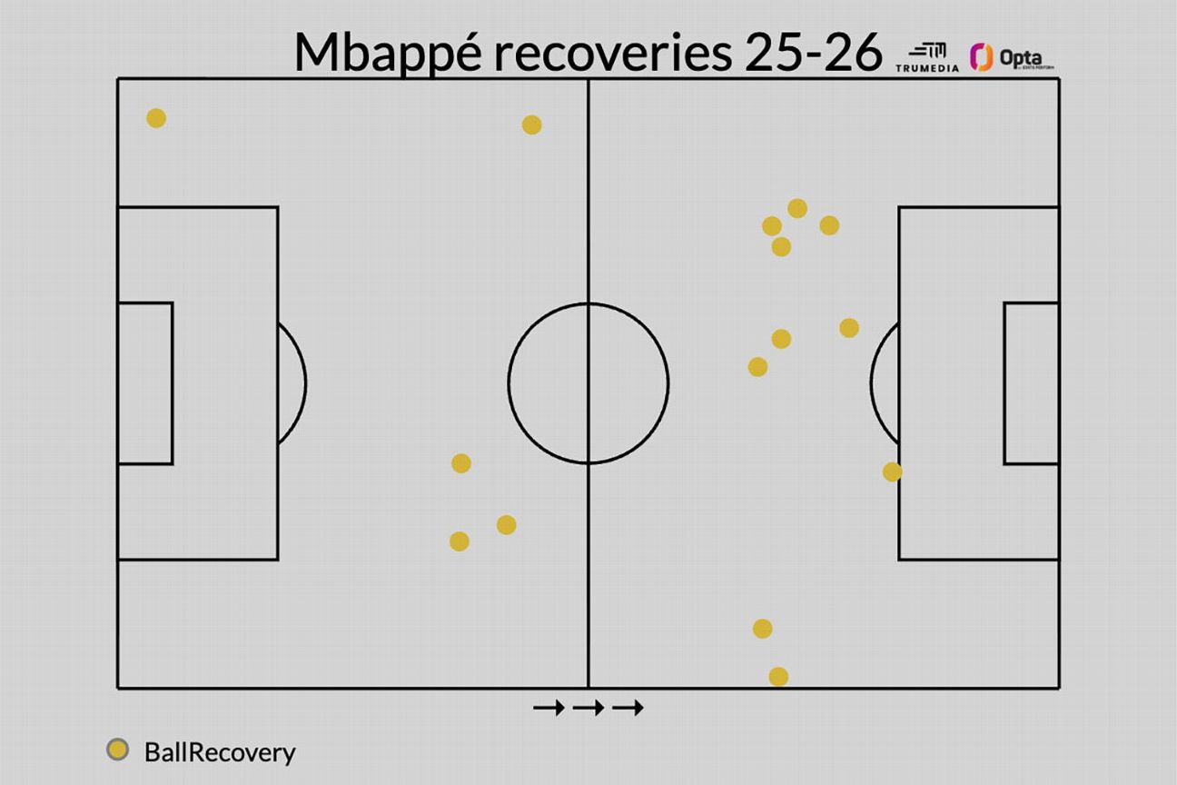 一些统计数据显示,姆巴佩在无球状态下的表现虽有所改善,但整体变化仍属渐进式而非彻底性变革。根据LaLiga Football Intelligence的数据,2025-26赛季,姆巴佩每90分钟的高压逼抢次数为12.47次,略高于2024-25赛季的12.41次;不过,他的高强度逼抢次数仅小幅上升至每90分钟9.39次,而上个赛季则是8.89次。