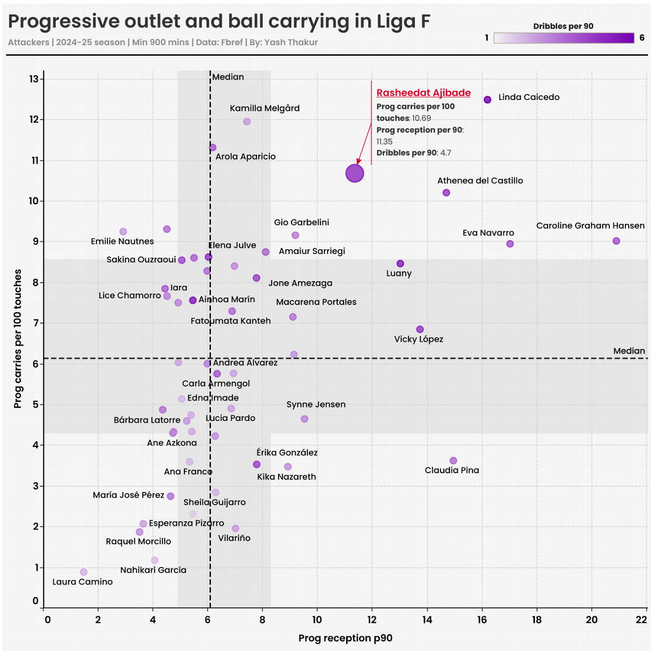阿吉巴德是一名极具爆发力的右脚边锋,擅长向前推进并制造威胁——正如上图所示,她在上赛季西甲联赛中位列前10名,场均接收到最多具有推进性的传球。此外,她每100次开放式触球中就有52次完成推进,这一数据位居联赛第七。