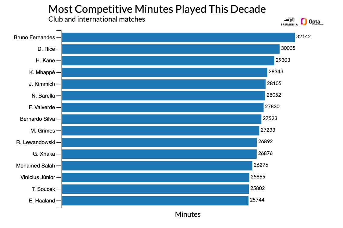 一名攻击型中场球员的职业生涯主要集中在22至29岁之间。此后,每个年龄段的表现都会出现显著下滑。大多数球员随着年龄增长,竞技状态都会逐渐下降。而费尔南德斯将在九月份迎来32岁生日。他或许是当今英超最出色的球员,但关于上赛季英超最佳球员,我曾这样写道:你可以将其中大部分专有名词替换成“布鲁诺·费尔南德斯”和“曼联”,情况几乎完全相同。当我将萨拉赫与同龄且仍保持同样高水平发挥的球员进行对比时,年龄曲线似乎并没有那么严峻:莱昂内尔·梅西、克里斯蒂亚诺·罗纳尔多、兹拉坦·伊布拉希莫维奇和罗伯特·莱万多夫斯基在进入三十多岁时,依然能够在最高水平的比赛中持续进球并帮助球队取胜。鉴于萨拉赫一直保持着极佳的身体状态,且几乎从未受伤,我认为他有很大几率将自己的顶级表现延续下去,超出年龄曲线所预测的范围。费尔南德斯展现出的稳定性和持久性,与这位利物浦传奇球星不相上下,甚至有过之而无不及。事实上,在Stats Perform的整个数据库中,自2020年以来,费尔南德斯在国际和俱乐部层面累计出战的比赛分钟数,仅次于巴西门将韦维顿,位居第二。若剔除门将和后卫——他们在单场比赛中通常较少被替换——前15名如下: