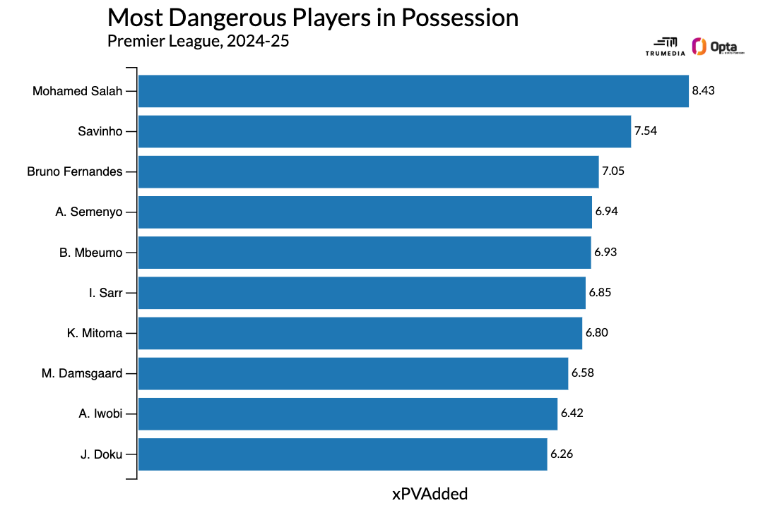 尽管萨维尼奥还没有打满2000分钟,但在所有英超球员中,他的预期控球价值排名第二: