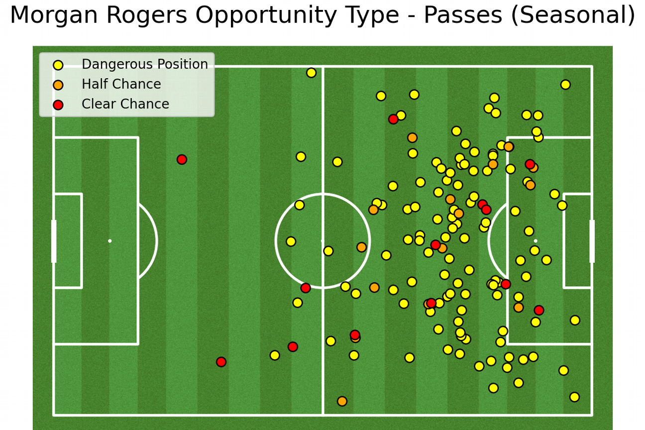 除此之外,罗杰斯正在做一些基于投篮的数据无法发现的事情。根据Gradient的数据,他有16.7%的传球进入了所谓的“危险区域”——在传球次数较多的球员中,仅次于萨拉赫和萨卡。