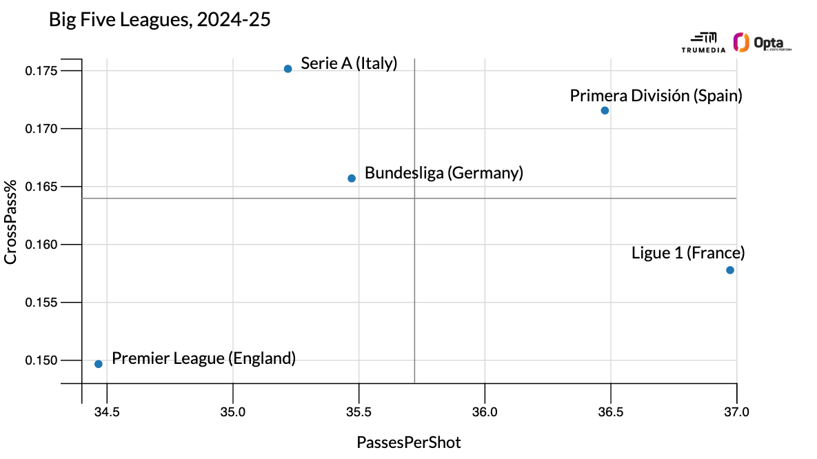 那么,这在球场上是如何体现的呢?至少在上赛季,英超联赛在几个方面脱颖而出。与其他四大联赛相比,英超联赛球队在控球时更加紧迫(以每射门传球次数衡量),并且传中次数明显减少(以最后三分之一区域传球中传中所占百分比衡量):