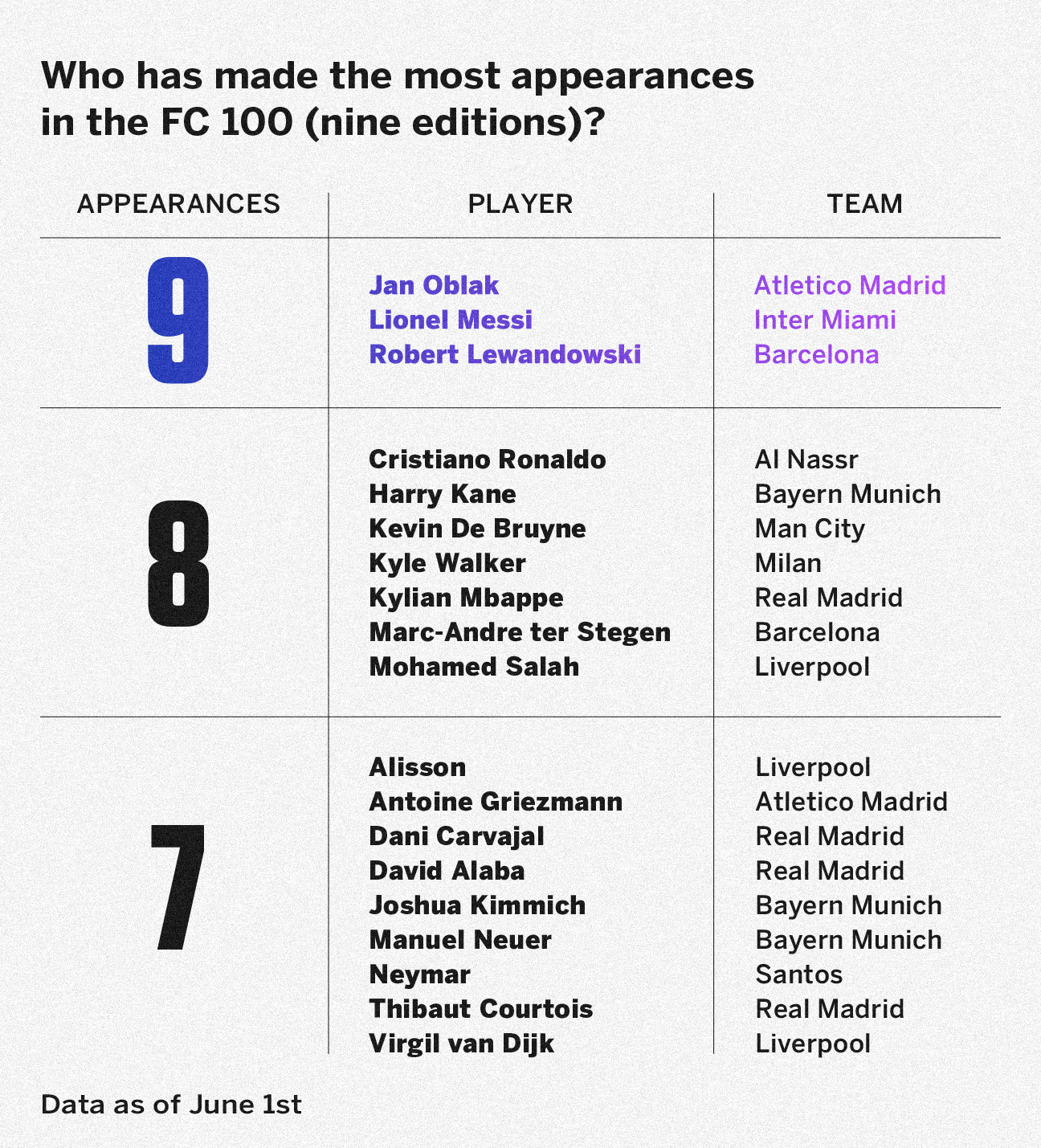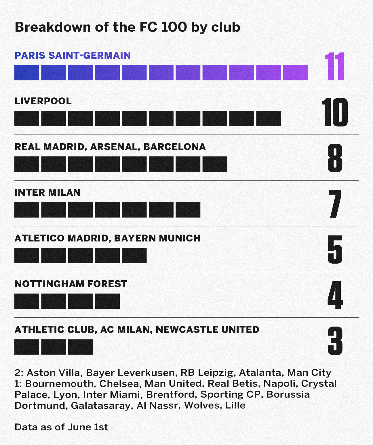FC 100投票趋势倾向于近期的表现,尤其是因为这份榜单旨在反映当前和本赛季的最佳球员。这一点体现在今年榜单的大量新面孔上:共有40名球员首次入选FC 100,这表明新一代球员正在崭露头角。作为这种更替的一部分,巴黎圣日耳曼在令人难忘的赛季后登上俱乐部排行榜榜首,令人难以置信的是,他们在所有国内赛事(法甲、法国杯、冠军联赛)中全部夺冠,并且在欧冠决赛中以5比0横扫国际米兰(后者有7名球员入选FC 100)。