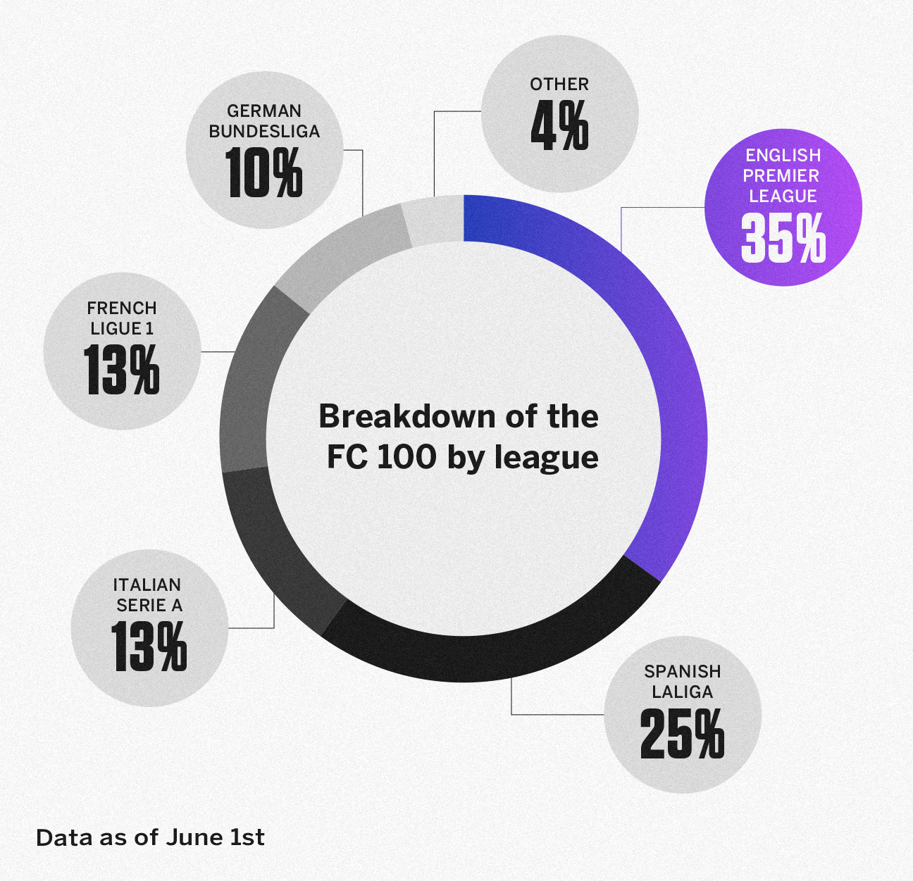 西班牙冠军巴塞罗那有8名球员入选FC 100,包括第1中场佩德里和第3边锋拉菲尼亚,标志着他们在主教练汉斯·弗利克的带领下真正重返巅峰状态。德国冠军拜仁慕尼黑也有5名球员上榜(其中哈里·凯恩(第3中锋)和贾马尔·穆西亚拉(第3攻击型中场)领衔),反映了他们重新回到德甲之巅。