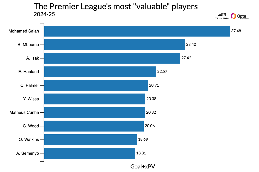 确定球员为球队提供多少价值的一个简单方法是看进球和预期控球价值。第一个,你知道的:一个球员有多少次把球越过终点线,在门柱之间,在横梁下。第二个是Stats Perform的模型,它为球员在球上做的每一件非射门的事情设定了一个值:每次抢断或传球等等增加了球队得分的机会。