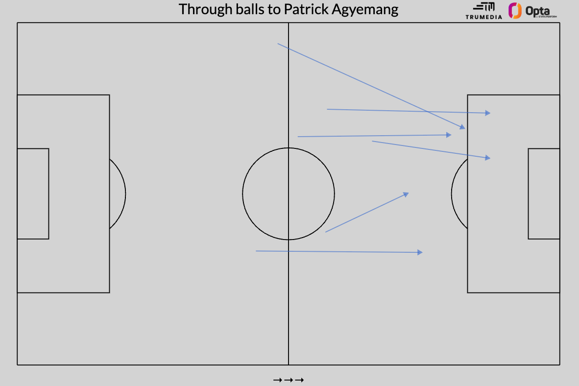 像Agyemang这样的前锋,你的发挥是有限的。你不能进行更复杂的构建模式或交换动作;你必须打很长时间才能把球传到场上,我认为这会让他在球队中的作用看起来比实际上更重要。