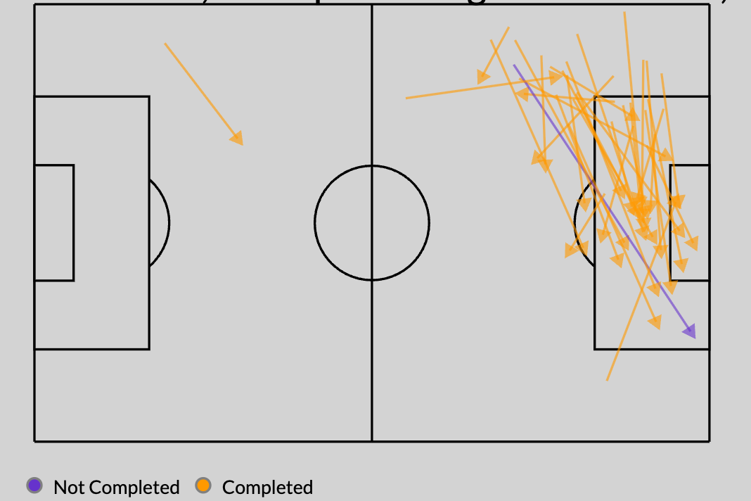 在欧洲五大联赛的边路后卫中,迪马科的预期助攻和传中次数排在第97位。而且,他身高5英尺9英寸。以下是他本赛季在空位进攻中创造的所有机会: