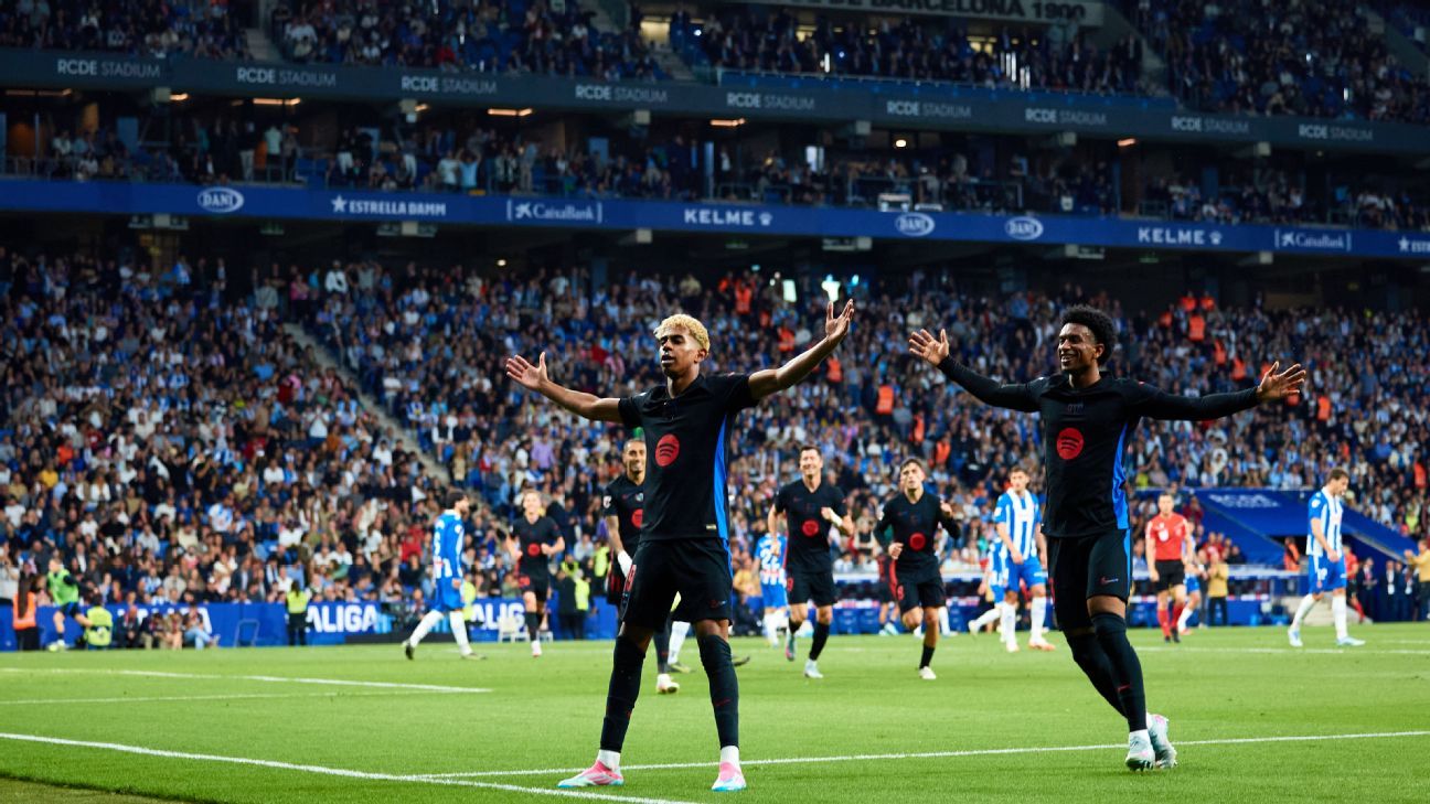 17岁的亚马尔在禁区外用一记精彩的左脚破门,帮助巴萨2-0击败同城对手西班牙人队,在只剩两场比赛的情况下领先皇马7分。