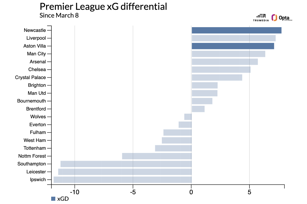纽卡斯尔在最近的10场比赛中只输掉了一场比赛,这一场比赛是输给维拉的,维拉在过去的15场比赛中只输了3场。自3月8日以来,这是仅有的两支联赛场均得分超过2.0分的球队(维拉2.63分;纽卡斯尔2.44),他们并没有真正超越他们的任何潜在数据。他们只不过是联盟前三名中的两支。