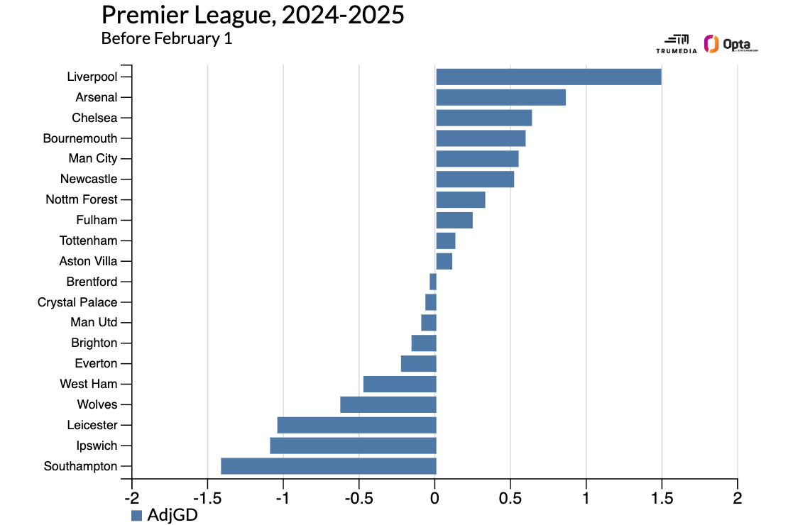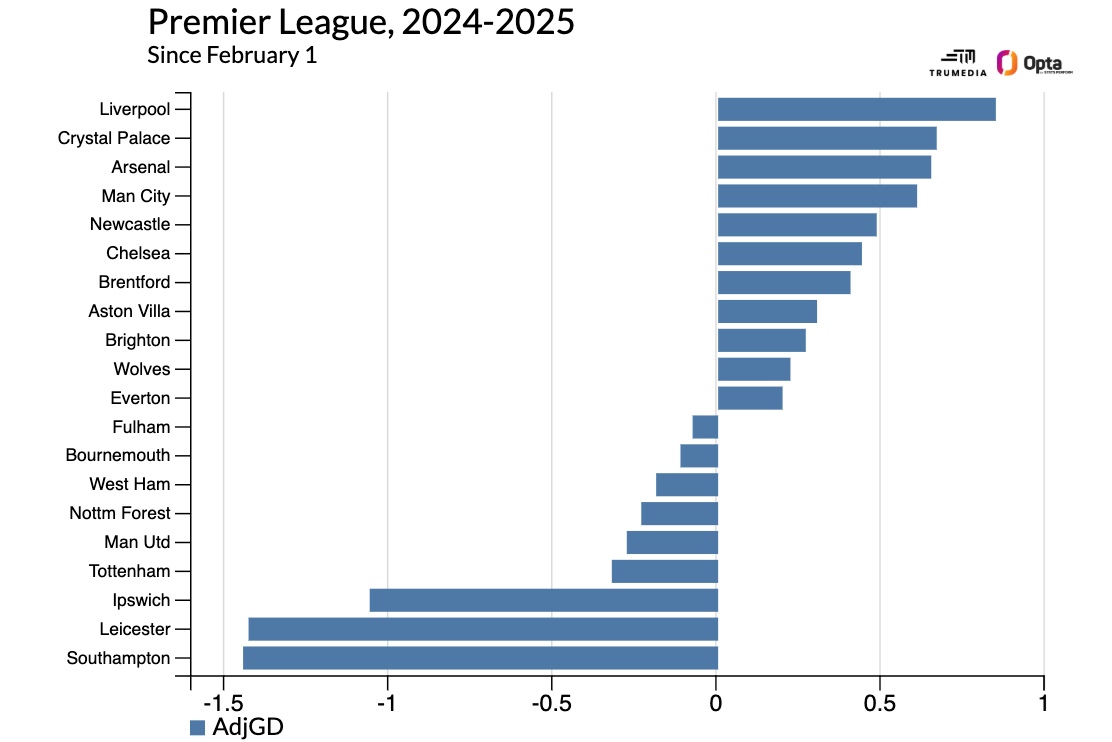 根据Transfermarkt的数据,今年1月,曼城为5名球员支付了2.18亿欧元的转会费,而欧洲其他俱乐部的转会费都没有超过5500万欧元。随着所有这些新球员的加入,以下是他们自2月初以来的表现——基于他们的调整净胜球(70%的xG和30%的进球数):