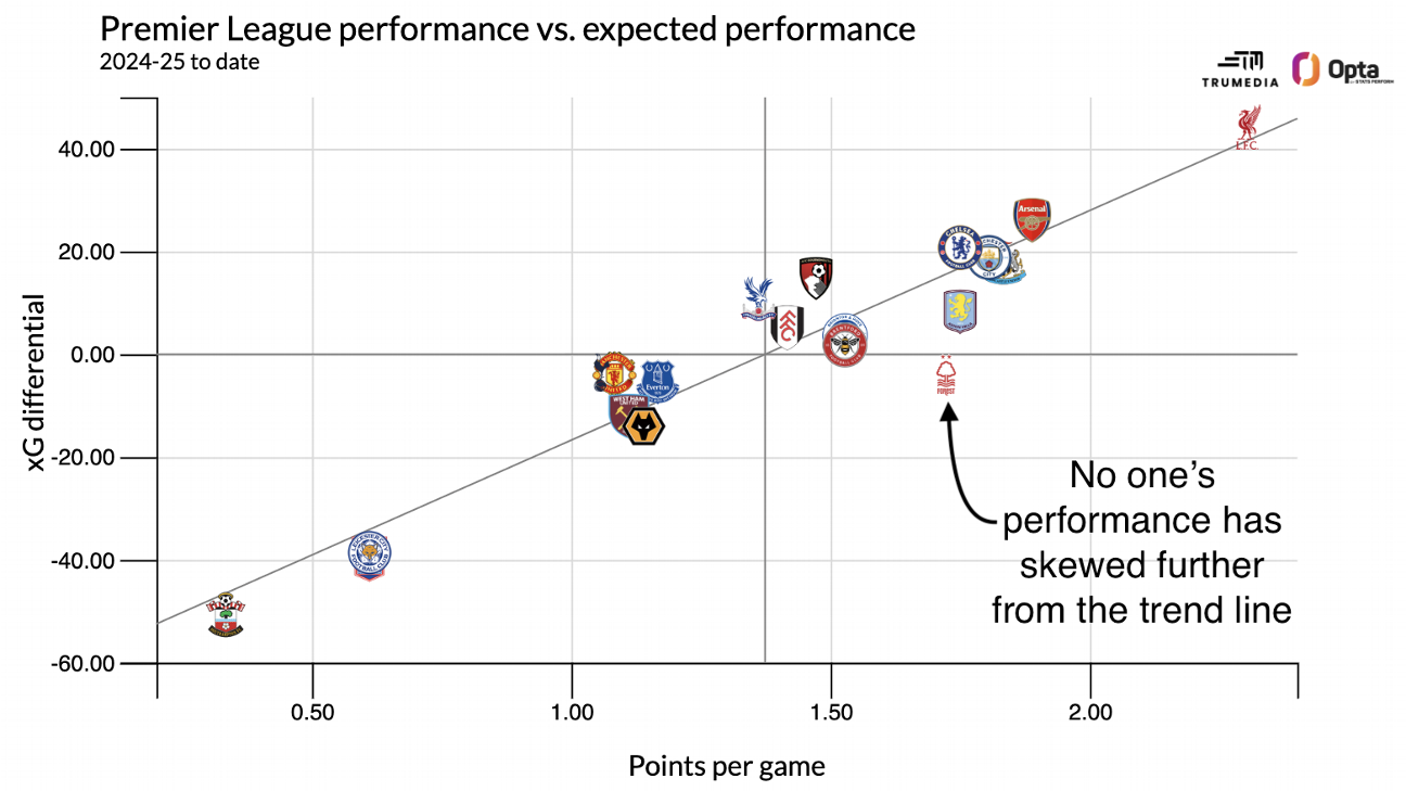 不过,这只是一种崩溃。看看高级数据,很明显森林队跑得特别热。唯一的问题是他们能否在回归现实之前锁定欧冠席位。现在看来不太可能。