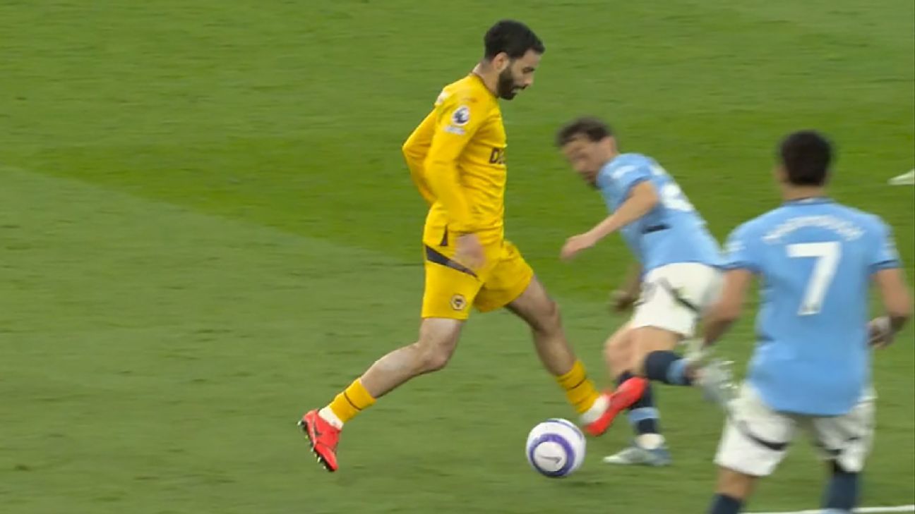 当Aït-Nouri试图绕过席尔瓦的挑战时,他似乎伸直了左腿——这是为了与曼城球员接触,还是为了保护球?只有他知道答案。