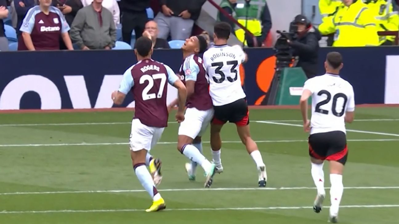 发生了什么:第32分钟,奥利·沃特金斯试图接住约翰·麦克金的球,但在安东尼·罗宾逊的压力下倒地。富勒姆后卫示意前锋站起来,裁判罗布·琼斯对点球不感兴趣。裁判克里斯·卡瓦纳(Chris Kavanagh)对此进行了检查。