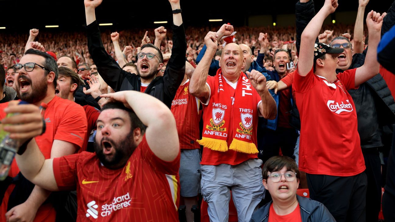 在下半场,身穿红色衣服的球迷多次高喊“冠军!”,在此期间,比赛暂停,以便将一个充气的英超奖杯气球从球场上移走。