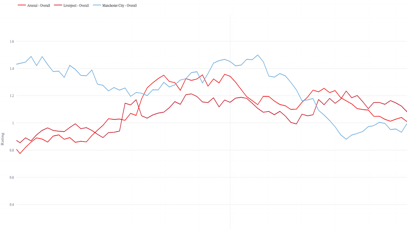 以下是自上赛季开始以来,利物浦、阿森纳和曼城的总体收视率变化情况: