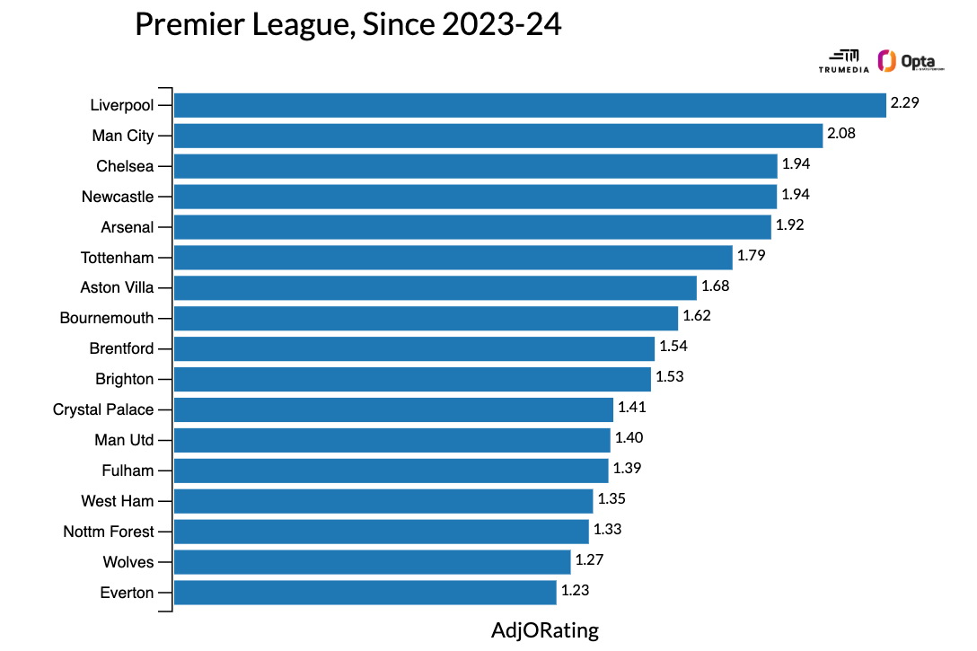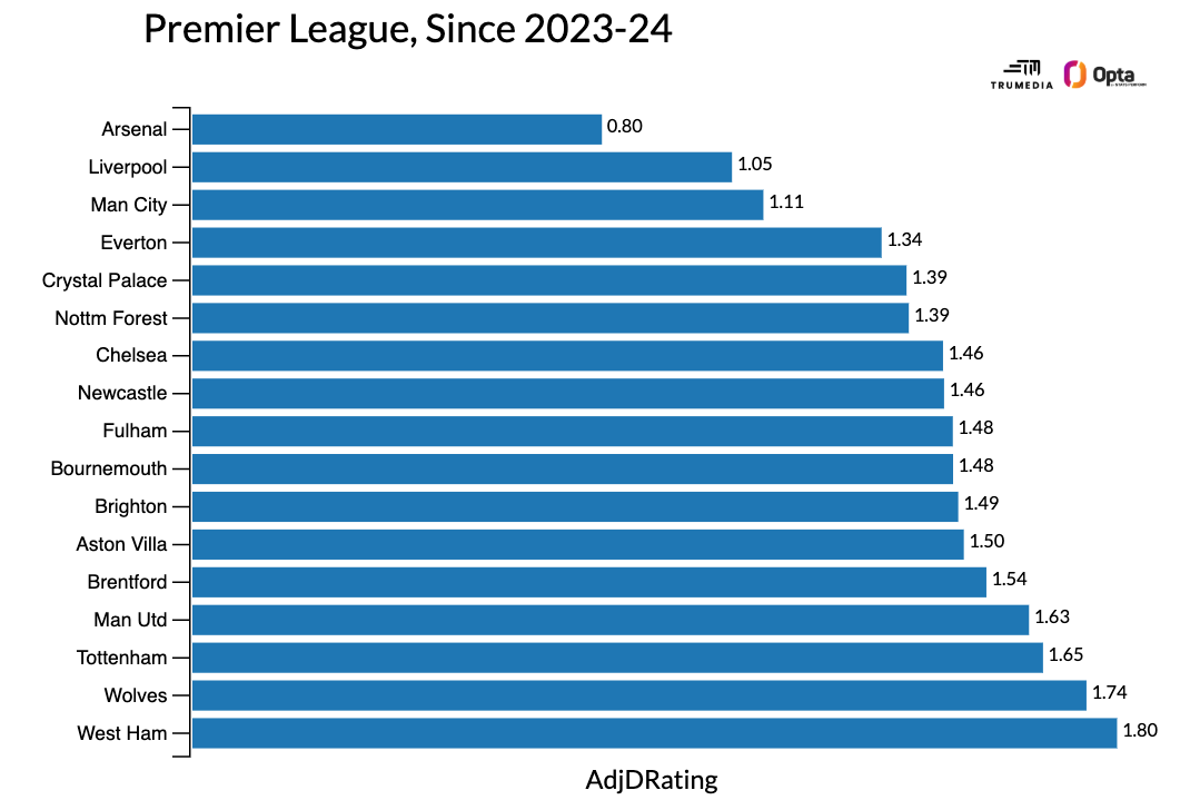 在过去的两个赛季里,阿森纳一直是英超防守最好的球队,而且还不是特别接近。与其他16支球队一起,下面是他们自上赛季开始以来的场均调整进球数排名(30%进球,70%预期进球):