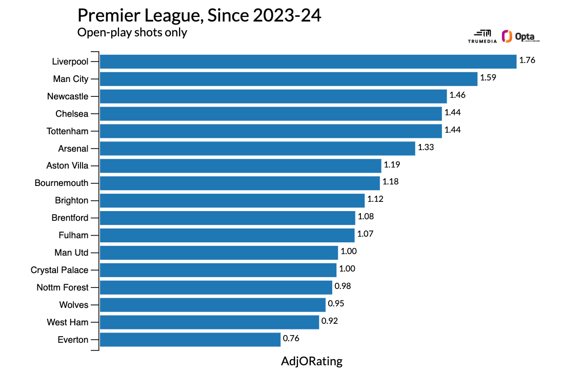 这在联盟中排名第三到第五。但其中很大一部分来自阿森纳联盟最佳的定位球系统。如果我们只看空挡射门,枪手队跌至第六位。他们的整体评分更接近最后一名狼队,而不是第一名利物浦。