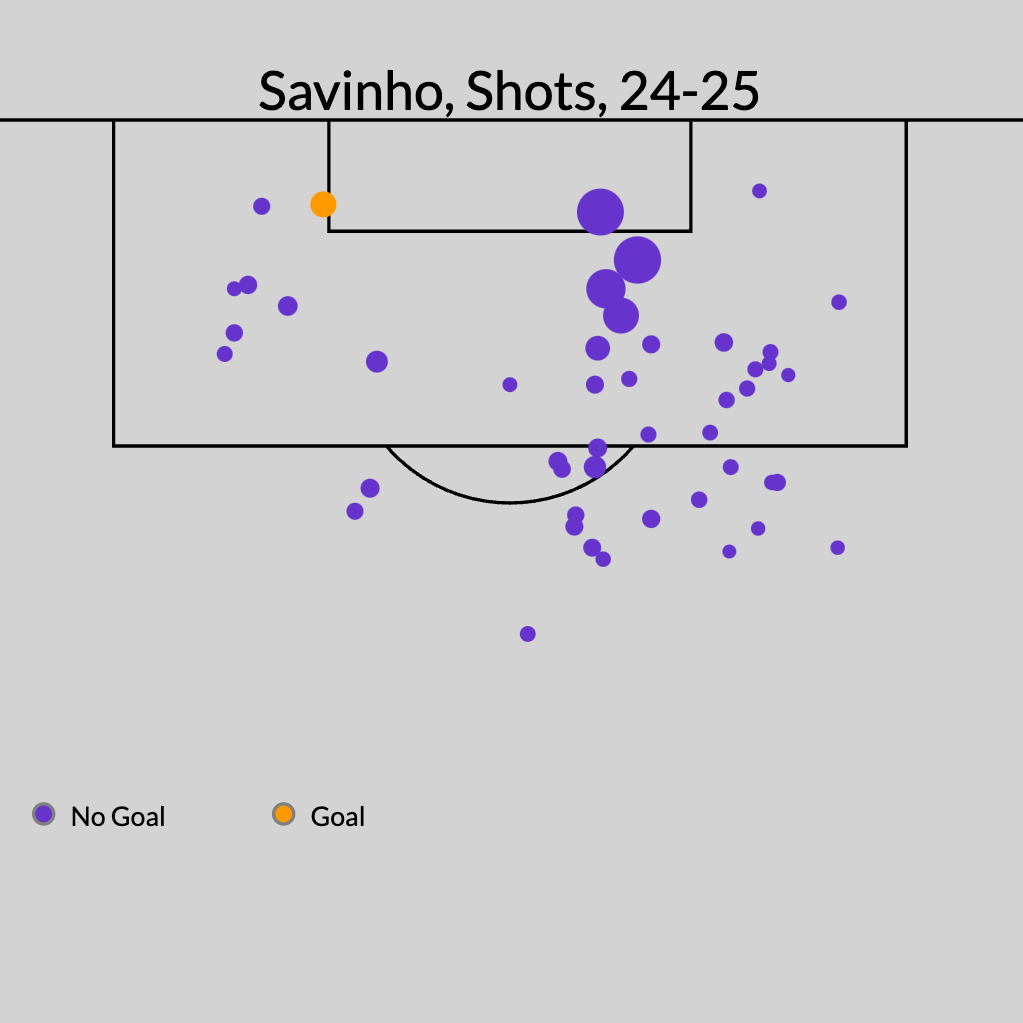 但总的来说,他在通过传球和射门创造的总xG上排名第二。虽然萨维尼奥不像杰里米·多库那样连续不断地传球,但他的传球和带球似乎往往会带来真正的危险机会。再说,他才20岁。如果真有萨维尼奥的股票,我会买的。