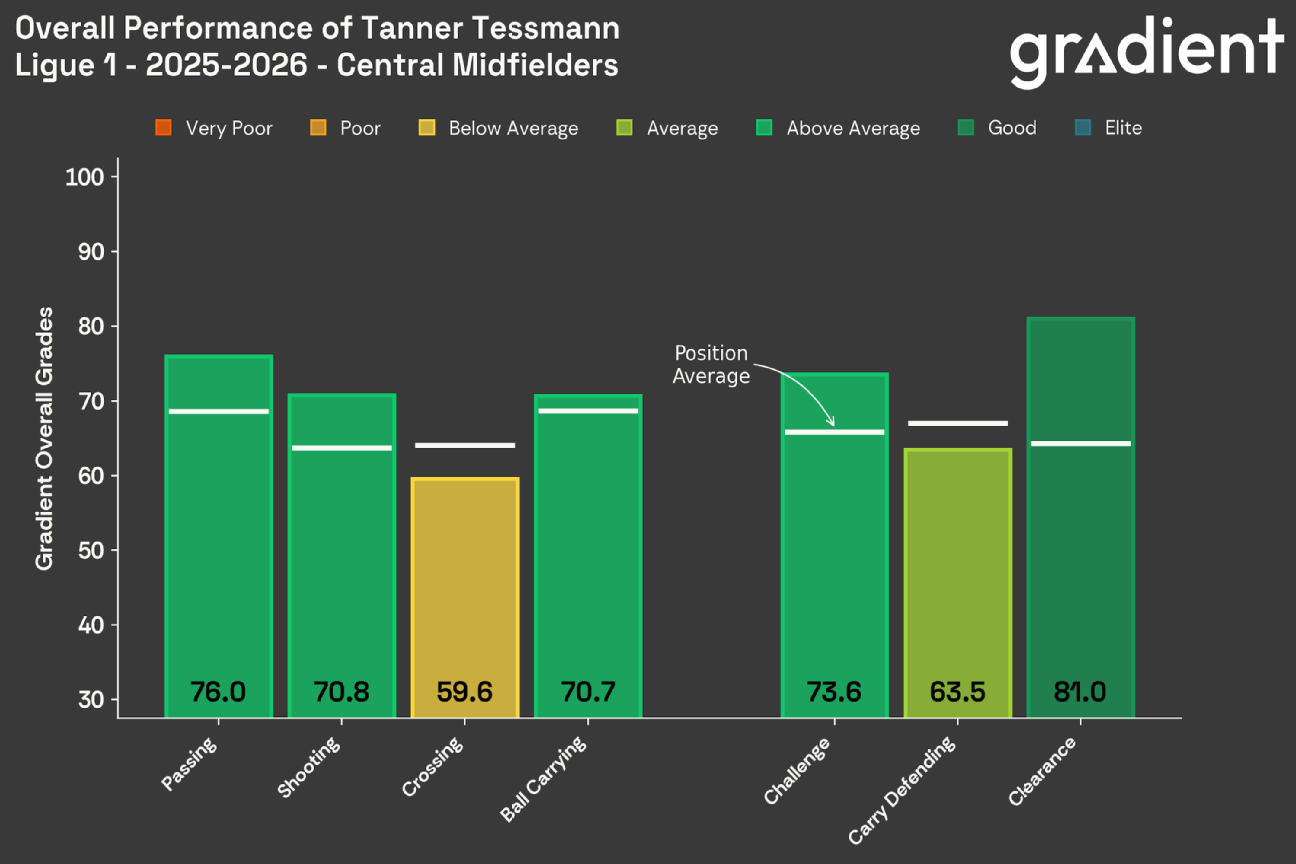 I don't think Tessmann is a future star or anything -- he's already 24 -- but he is a solid starting midfielder for a fringe Champions League team in France. Here's how he fares compared to his peers in Ligue 1, per the various grades from Gradient Sports: