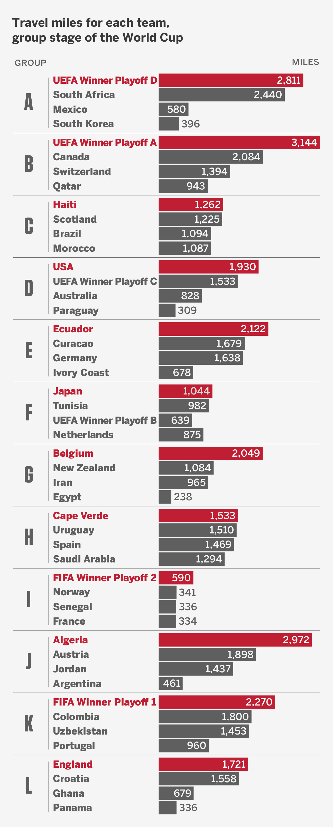 • The 2026 World Cup across three countries provides more complex travel arrangements than Qatar 2022, for obvious reasons given the smaller size of that host nation, but this might be a lighter load than Brazil 2014, which saw teams traveling on average more than 2,000 miles more during the group stage.