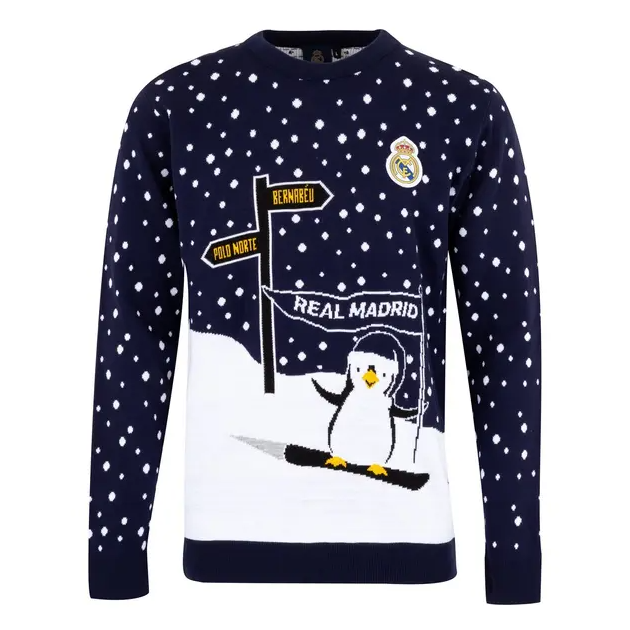 皇家马德里也是个习惯为球迷准备全套圣诞毛衣的大俱乐部,不过今年大部分设计都是沿用了2024年的款式。新加入的是一款有趣的聚酯纤维小场景,描绘了一只正在从北极前往伯纳乌球场的滑板企鹅。