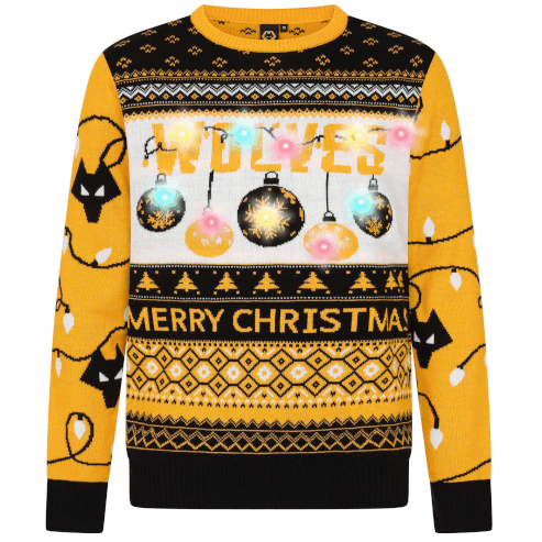 作为英超唯一一家彻底拥抱这个季节俗气氛围的球队,狼队推出了他们所谓的“叮叮当当亮灯圣诞毛衣”。毛衣上有着古金色针织图案、狼头造型,甚至还内置了会闪烁的真彩灯串。既喜庆又明亮。