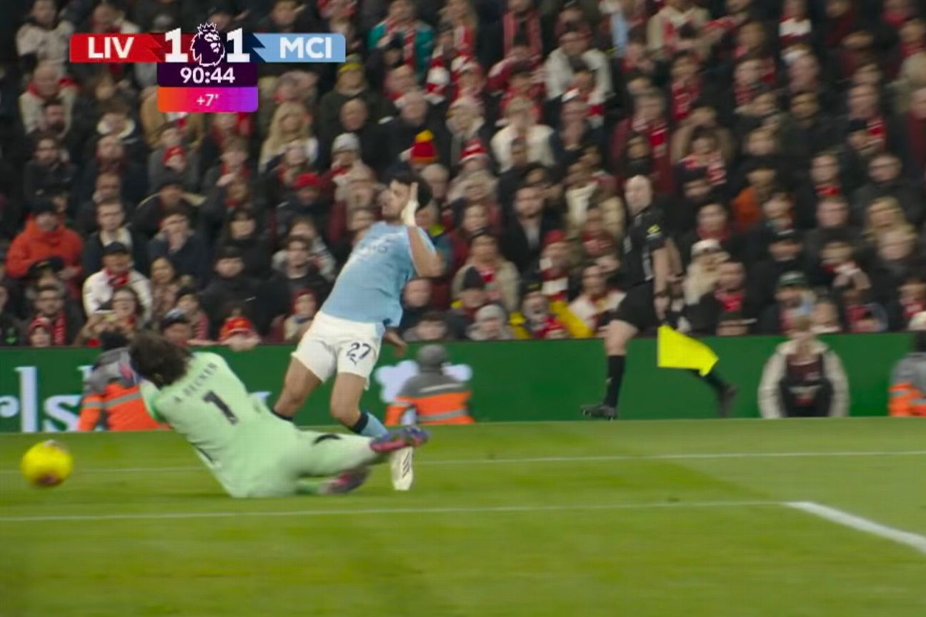 随着皮球滚向空门,利物浦后卫索博斯洛伊试图滑铲解围,但在他完成动作之前,哈兰德反手拉住了索博斯洛伊,阻止了他触球,皮球顺势滚入空门。