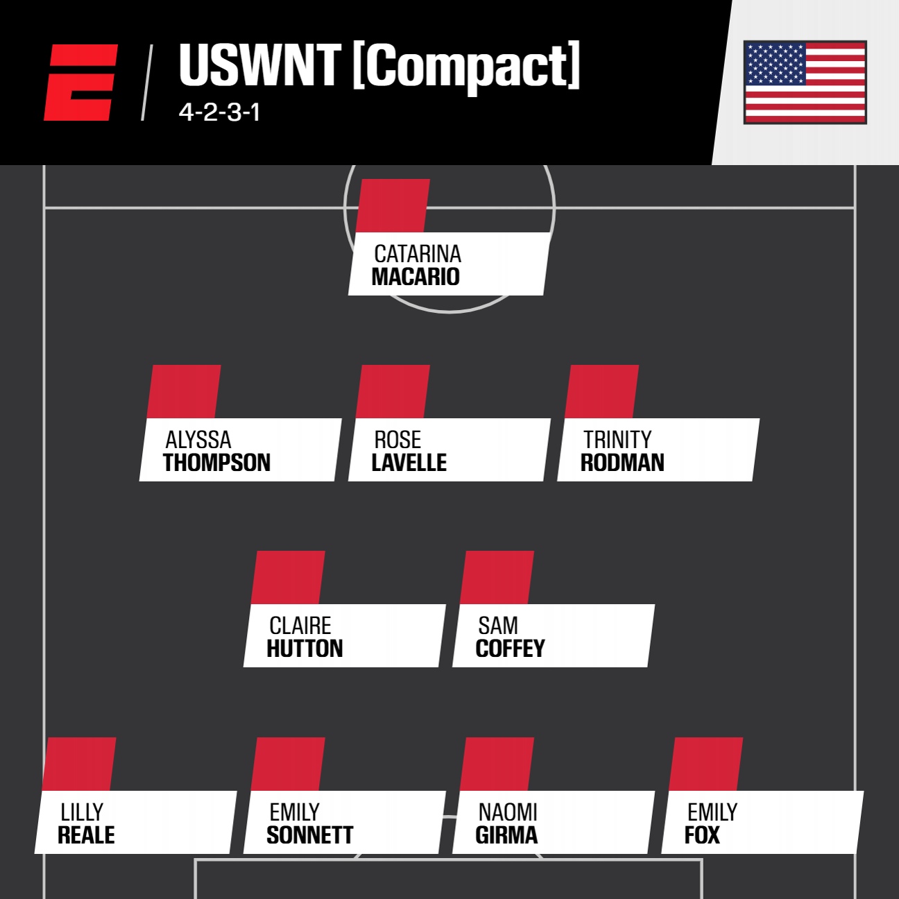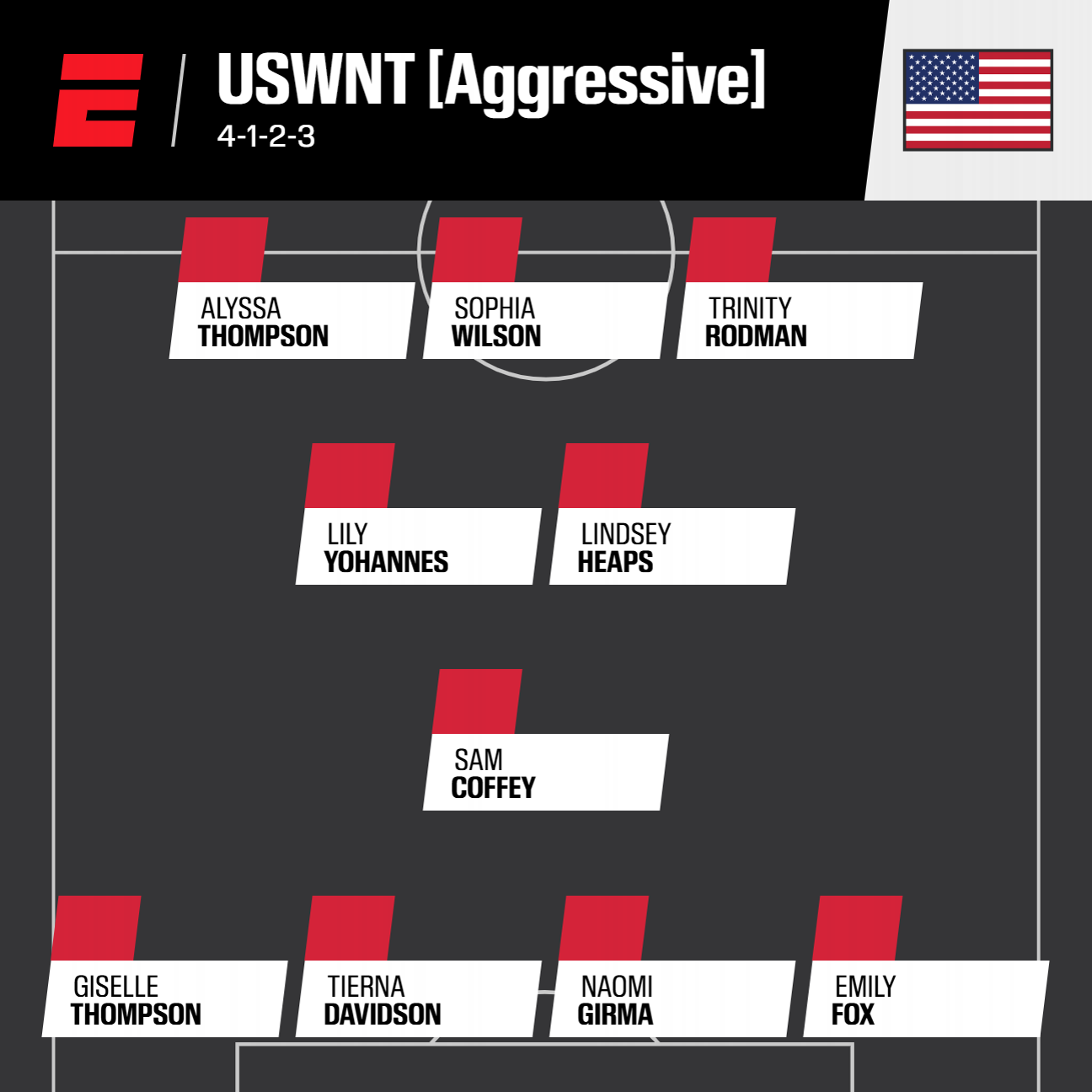 你可以看到,如果我们假设美国女足采取积极进攻的打法(就像最近对阵阿根廷时那样),或者海耶斯认为在面对更强对手时需要更多保障,那么阵容可能会是什么样子——最近两次对阵加拿大的比赛就是很好的例子。
