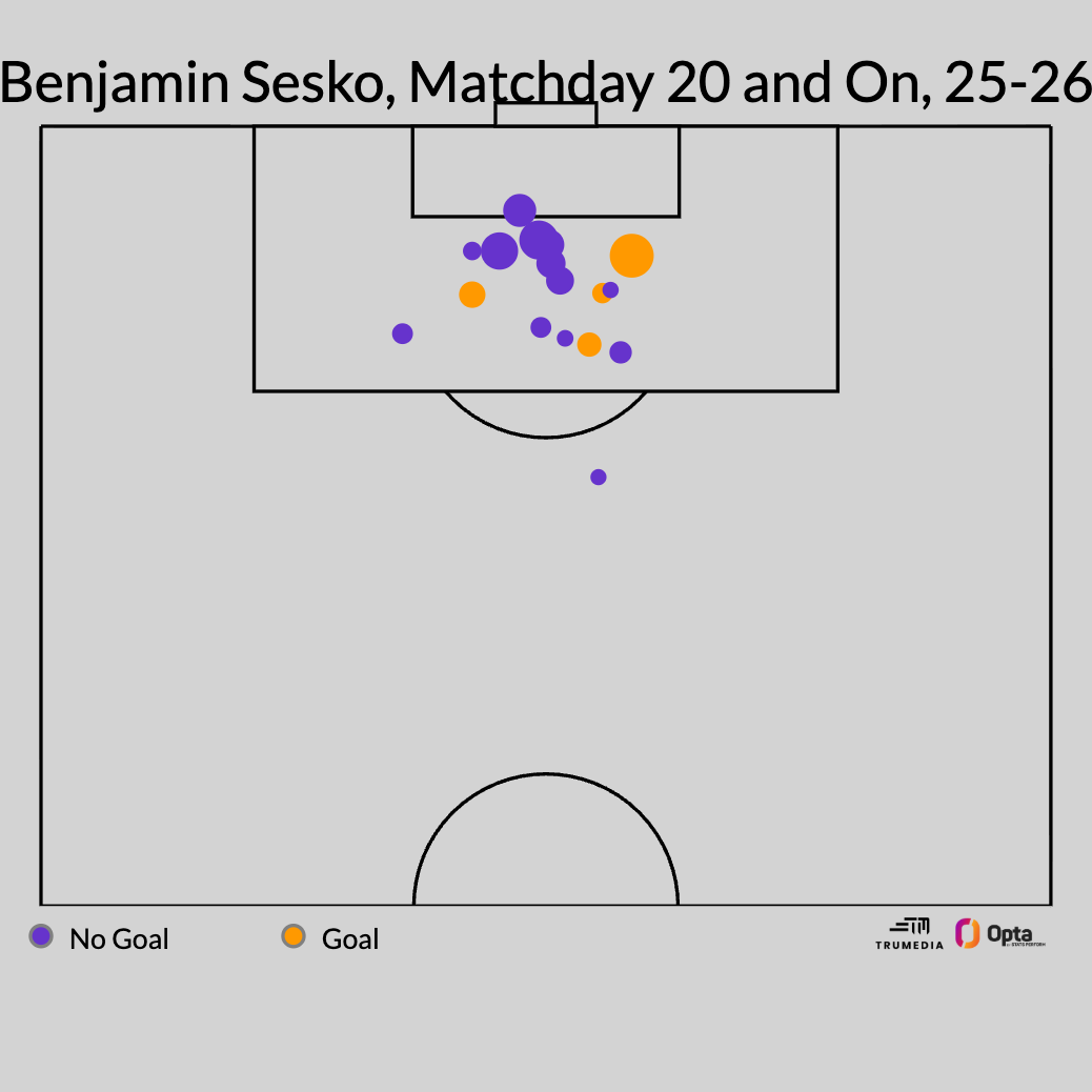 维尔茨、埃基蒂克和西蒙斯几乎在所有指标上都有显著提升——而且他们在下半赛季已经踢了不少分钟。塞斯科的传球数据全都下降了,但他的每90分钟射门产量却高得惊人,从赛季中段开始就一路飙升。
