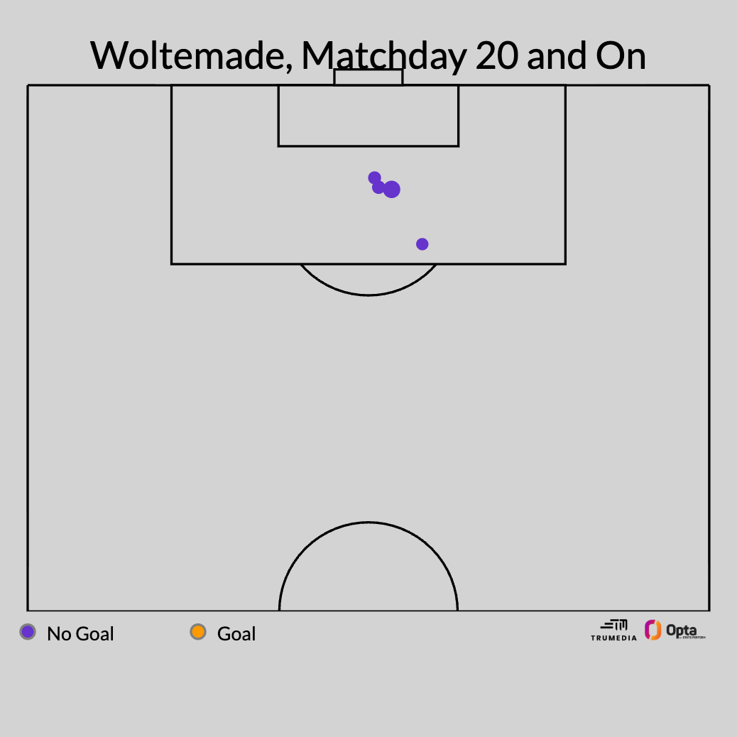 沃尔特迈德则是唯一一个明显偏离积极趋势的球员:他此前平平无奇的传球数据有所回升,但他至今还没在下半赛季进过球,预期进球数更是下降了76%。这是他下半赛季的所有射门数据: